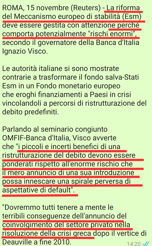 Ecco cosa ha spinto due europeisti convinti a usare quei toni catastrofici per parlare dei rischi della riforma del MES. Ecco, ovviamente sulla stampa dominante di questa cosa non se ne è praticamente parlato. E, chi ne ha parlato, è riuscito stravolgere a tal punto le parole di Visco da fare diventare questa riforma addirittura un bene.