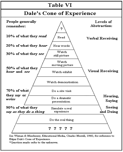 - Il secondo passo (corruption of Dale’s Cone of Experience) consiste nella prova della corruzione del grafico originale. Thalheimer è infatti andato a verificare l’immagine inserita da Dale nel suo libro (Audio-visual methods in teaching – edizione 1969), scoprendo che Dale non aveva inserito nessun numero sul suo grafico originale e, anzi, avvertiva i lettori di non prendere il suo grafico alla lettera (vedi grafico originale a fianco).