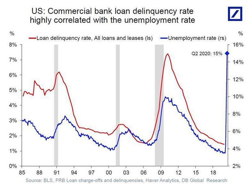 Eppure qualcosa non va nell’economia reale, e non è  dovuto solo alla crisi per il Covid-19, e questo avrà delle conseguenze devastanti sul sistema creditizio mondiale. Prima di tutto vediamo gli USA e come si muovono se sofferenze bancarie in modo parallelo con la disoccupazione: