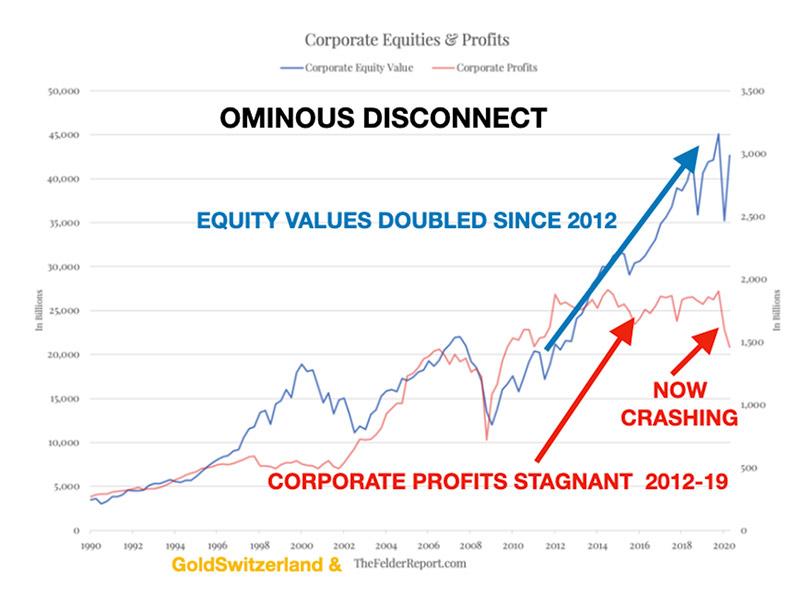 Già dal 2016 i profitti delle aziende non crescevano al crescere del valore delle azioni , ora addirittura i profitti calano mentre le quotazioni crescono. Il assoluto il rapporto prezzo utili P/E non è ai minimi storici, anzi, siamo a livelli ben superiori rispetto a quelli degli anni 50 e degli anni 80, veri periodi di boom borsistico generalizzato, ma l’andamento attuale è unico e spiegabile solo con l’afflusso di denaro dalle banche centrali.