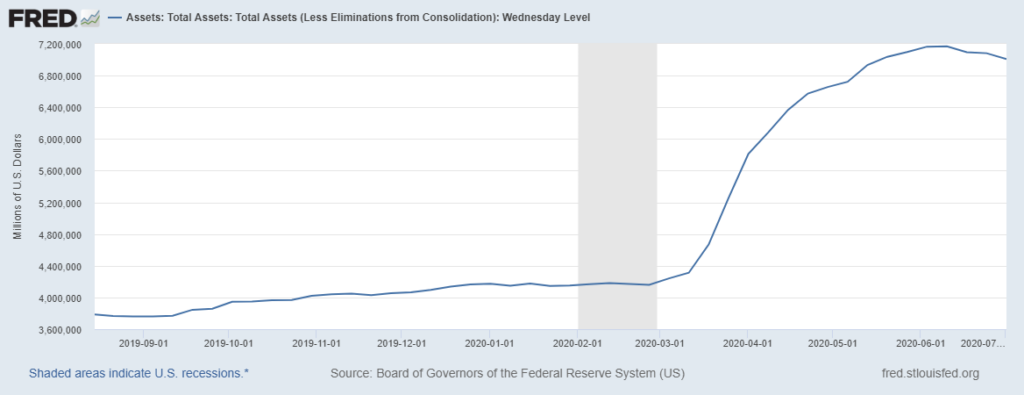 La BCE e la FED hanno inondato il mercato con grandi quantità di denaro: la BCE ha reato i 1350 miliardi del PEPP, oltre ad aver proseguito il TLTRO a favore delle banche. Nel frattempo la FED ha incrementato il proprio attivo in modo potente, anche se da giugno si nota una flessione: