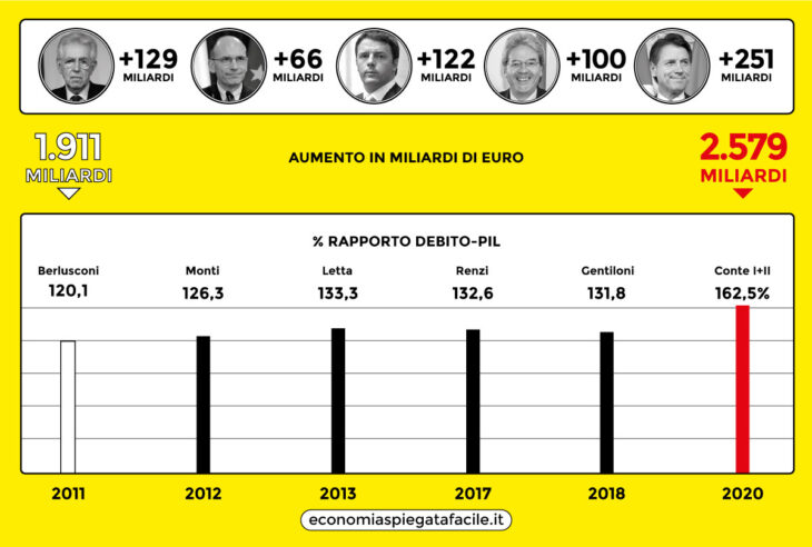 I Governi Conte I e II, supini o proni, a seconda dei gusti, rispetto alla UE nei trattati sui fondi di aiuto europei, pur avendo fatto spesa pubblica solo a chiacchiere ha fatto aumentare il debito pubblico di 251 miliardi (OK il 160% del rapporto debito/PIL dovuto al calo del PIL, causa lock-down).